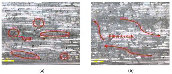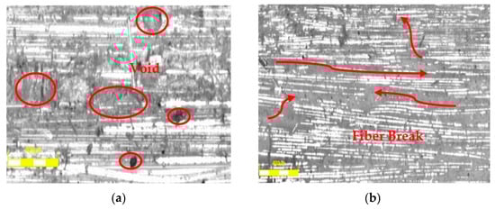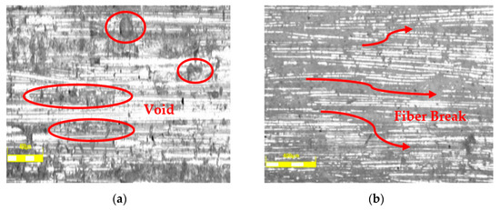 As shown in Figure 7a, Figure 8a and Figure 9a, the void defects dispersed in the material matrix, which reduced the strength of the material, and a slight matrix cracking damage emerges in the material. With the defect evolving, the voids gradually deformed and propagated, and the area of the plastic deformation cumulative area became larger and the deformation was also irregular. When the internal fibers of the material were continuously destroyed, the friction between the layers was increased to release more heat dissipation energy, causing the temperature to rise sharply. Then, the structure near the internal defects of the material has undergone an irreversible deformation and the actual damage occurred. At this moment, the internal stored energy value went up to its maximum, and the corresponding internal microstructures are shown in Figure 7b, Figure 8b and Figure 9b. It can be seen that the fibers were completely withdrawn from the matrix, and the bearing capacity was no longer available, indicating that the actual damage began to form. The tests of three groups with the same phenomenon also verified the correctness of the method that the actual damage moments can be identified by the internal energy storage maximum.