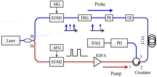 A typical DPP-BOTDA scheme was implemented to realize high spatial resolution offshore wind turbine pile monitoring, as shown in Figure 1. A narrow-linewidth (40 kHz) optical fiber laser was used as the light source, which operates at a wavelength of 1550 nm and outputs a power of 80 mW. Then, a 3 dB coupler was used to split the output beam into two arms. In the upper arm, the laser beam was double-sideband modulated by means of an intensity electro-optic modulator (EOM1), which was driven by the microwave generator (MG). Then, the lower sideband was selected by a fiber Bragg grating (FBG), working as the probe wave. An orthogonal polarization scrambler (PS) was used to reduce polarization fading. Right before being launched into the fiber under test (FUT), the probe wave went through an optical isolator (OI), which was used to prevent the high-power pump pulse.