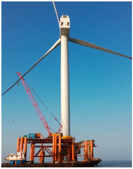 The test platform is located on the Y14 wind turbine which belongs to the Xinghua Bay Wind Farm in Fujian, China. As shown in Figure 2, the Y14 wind turbine is a DEW-G5000 produced by Dongfang Electric Corporation, China. This wind turbine has a rated power of 5000 kW, a hub height of 90 m, a rotor diameter of 140 m, and a total weight of 733.5 tons. The foundation of a Y14 wind turbine is composed of four pile foundations. In order to obtain the bearing capacity of the pile foundation, a test pile was made next to the Y14 platform, and the design and construction process is the same as the Y14 platform pile.