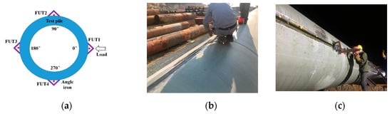 In the test, the single-mode strain sensing fiber with a diameter of 0.6 mm was used, and four fibers were arranged at an angle of 90° along the perimeter of the steel pile. The location of the DOFS are shown in Figure 4a and the DOFS are named FUT1, FUT2, FUT3, and FUT4. Due to the harsh environment in which the pile was located, only FUT1 and FUT3 survived in the final test. Epoxy rubber and carbon fiber cloth were adhered to the DOFS as shown in Figure 4b, and the angle iron was welded to the outer wall of the test pile in order to protect the DOFS, as shown in Figure 4c. The initial point elevation of the fiber strain measurement was +10.0 m, and the end point elevation was −43.3 m. Finally, the length of the measuring fiber was 53.3 m.