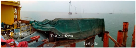 As shown in Figure 5, the entire experimental device was divided into three sections: test pile, horizontal load test reaction frames, and Y14 platform. The test pile had been driven into the soil according to the standard construction process. The Y14 platform was a well-built wind turbine platform. The experimental platform was fixed on the Y14 platform to ensure safety during the test.