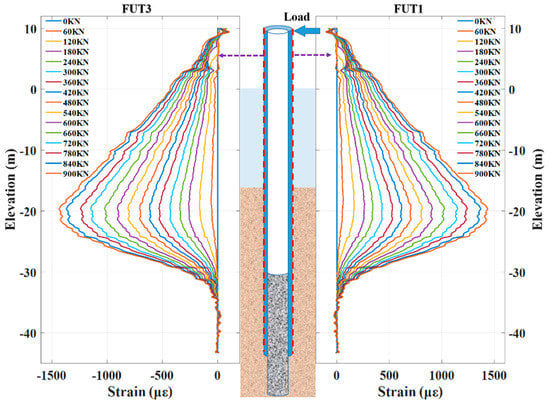 The temperature-compensated strain values can be calculated by Equations (1)–(3). At the corresponding elevation, the strain values of FUT1 and FUT3 are shown in Figure 6. The FUT1 side is subjected to tensile stress and the FUT3 side is subjected to compressive stress. Above sea level, as the load increases, the strain values on both sides of FUT1 and FUT3 show large errors. The reason is that the received light is different on both sides during the test (12:50 p.m.–07:00 a.m.), which in turn affects the temperature and ultimately causes the different changes in the Brillouin frequency shift. However, this error does not affect the determination of the bearing capacity of the pile. The maximum strain value at the load of 900 kN was 1436 με, and the position was at −19.63 m. This position is in the fine sand layer. At the elevation of −35.0 m to −43.3 m, the strain values hardly changed with the load and were near 0 με. The reason is that, at the elevation of −30.5 m, the test pile was the tube filled with reinforced concrete. Then, the bending stiffness was dramatically enhanced, so the strain values were always small with the load increasing.