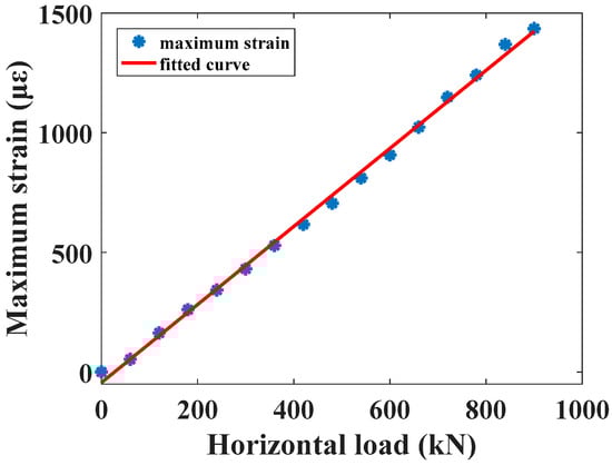 From the distributed strain values of the pile, the load and maximum strain (F-εmax) curve could be obtained, as shown in Figure 7. A linear fit was performed on the data in the figure, and the fitted results are shown in the solid red line. The R-square is 0.9986. The fitted results show that the maximum strain value of the pile was linearly related to the load, and the strain coefficient under load was 1.631 με/kN. The maximum stress was 295.8 MPa, which does not exceed the yield stress of Q345 steel. The stress ratio of 0.86 indicates that the pile was still in the elastic stage. Therefore, it can be concluded that the horizontal bearing capacity of this pile exceeds 900 kN, which satisfies the standard of horizontal load capacity of offshore wind turbines.