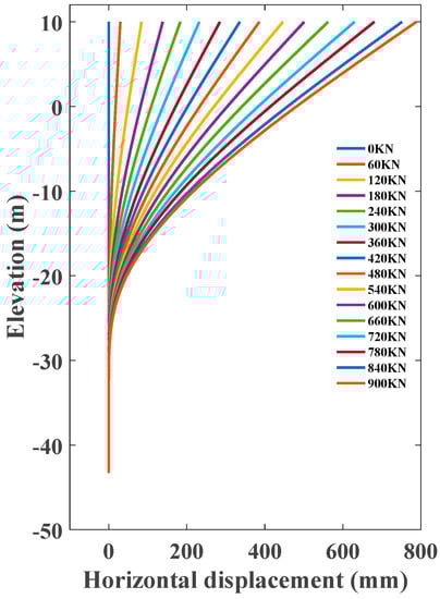 The strain data collected by the distributed optical fiber sensor are dense and continuous, and the distributed displacement curve of the pile was obtained by the second integral of the corresponding curve. The calculated displacement is shown in Figure 10. As the load increased, the absolute value of the displacement measured by the fiber increased. The force on the fiber at FUT1 was the tensile, and the displacement value was positive. The force on the fiber at FUT3 was the pressure, and the displacement value was negative. The maximum displacement occurred at the uppermost end of the fiber, the elevation was +10.0 m, and the maximum displacement generated under the 900 kN load was 0.79 m.