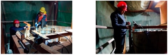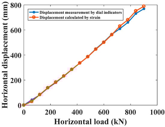 During the test, the horizontal displacement of the pile was measured at the elevation of +10.5 m by the dial indicators, as shown in Figure 11. The dial indicators base was fixed to the reference beam, and its direction parallel to horizontal load direction. The horizontal displacement data collected at different load levels is shown in Figure 12. In the figure, the blue curve is the data collected by the dial indicators, and the red curve is the displacement data calculated by the distributed strain. It can be seen from the figure that the horizontal displacement obtained by the two methods was very close. The ratio coefficient between the displacement of the pile top and load was 0.9136 mm/kN.