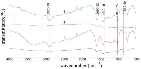 FT-IR spectra obtained from the raw coal and the residues after extractions. (1) Raw coal. (2) Residues from the microwave-assisted extraction (MAE). (3) Residues from the Soxhlet extraction (SE). (4) Residues from the ultrasonic-assisted extraction (UAE).