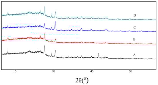 XRD spectra for the raw coal and the residues after extractions. (A) Raw coal. (B) The residues from the UAE. (C) The residues from SE. (D) The residues from the MAE.