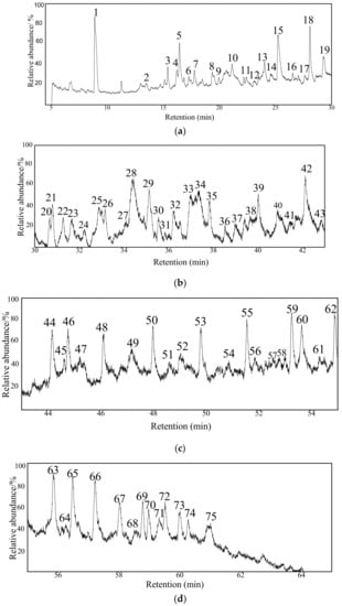 TIC for the extract obtained by the MAE process. (a) TIC of 5–30 min; (b) TIC of 30–43 min; (c) TIC of 43–55 min; (d) TIC of 55–65 min.