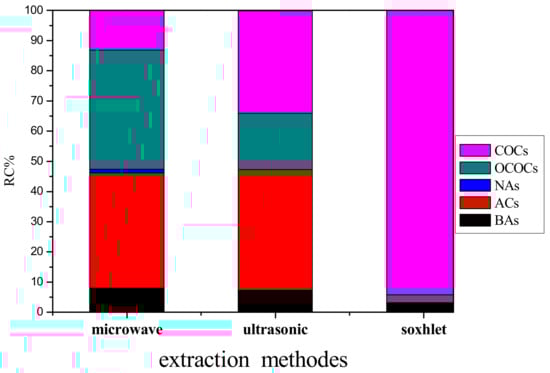 The TIC for the extract obtained by MAE is shown in Figure 5. In total, 75 substances were detected in the extract, which are provided in Table S3 in Supplementary Materials; categorially, these 75 substances are also listed in Table 2. The most salient future is that the number of the extracted substances was increased drastically whereas the increased substances are from the class of oxygen-containing compounds (OCOCs); the total amount of OCOCs is also the highest among the three extraction methods. On the other hand, the level of aromatic compounds was remained almost unchanged compared to the UAE. In addition, a small portion of NAs (1.19%) was found, which is in contrast to the other extraction methods. Moreover, a few biomarker compounds were also identified including hexaoxane (Peak 44), 2-methylcholest-3-ene (Peak 63), 6,9,12-tripropylheptadecane (Peak 65), and 17-alfa-21-beta-28,30-bisnorhopane (Peak 69) in Figure 5. Figure 6 illustrates the compositions according to the categories. The extracted relative content and species of the three extraction methods are shown in Figure 6. Compared with other two kinds of extraction, the species extracted by MAE is more, but the content of COCs is less, which might be attributable to carbon tetrachloride as a non-polar solvent is not conducive to the transmission of microwave energy, and will slow down accelerated movement of polar molecular reactants, and can also reduce the collision frequency between reactants. NAs and Bas are extracted more than the other two extractions. Therefore, the MAE method is especially suitable for the extraction of compounds with high solubility in nonpolar solvents.