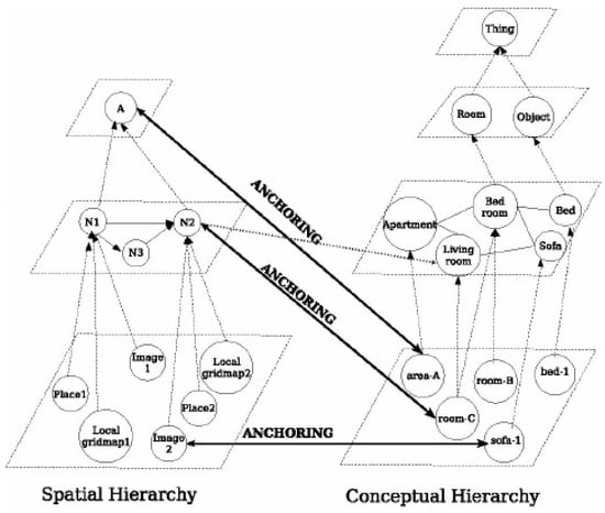 The potential of this representation was extended in subsequent works that implemented semantic navigation schemes. For example, the planner was improved in Galindo et al. [81] and a more recent work includes autonomous generation of objectives [82]. The work of Zender et al., follows a similar line but, in this case, the multi-hierarquical representation is replaced by a simple hierarchy [15]. This is achieved by moving the map data from sensors to conceptual abstractions. The tool selected to code this information was Ontology Web Language-Description Logic (OWL-DL), resulting in an ontology that defined an office domain.
