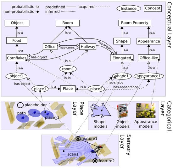 The literature offers different ways of representing high-level knowledge in navigation tasks. Semantic navigation approaches builds upon some of these knowledge representation paradigms. This is the case of Pronobis and Jensfelt that propose a spatial representation in a layered structure [17] as shown in Figure 3. This representation can describe usual knowledge as relationships between concepts (e.g., a kitchen contains-the-object cereals). Additionally, instances of knowledge are described as relations between instances of concepts (object-1 is-an-instance-of cereals), or relations between instances and other instances (place X has–the-object object Y). Relationships in the conceptual map can be predefined, acquired or inferred. These relations can also be deterministic or probabilistic (modelling uncertainty). This semantic navigation system bases inference on deductions on the unexplored space, such as predicting the presence of objects in a location with a known category. Additionally, this system is able to predict the presence of a room in unexplored space. Adding features to objects can also provide useful information since they can modify the functionalities of the objects [19]. For instance, a broken chair may not be used for sitting and be located in a workshop instead of in a living room.