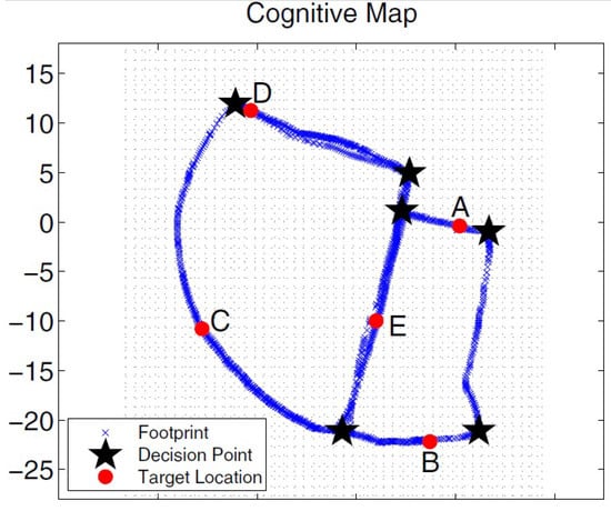 When building cognitive maps, knowledge is extracted from present and historical information (previous knowledge), imitating the mechanisms of the human brain to solve complex cognitive problems in a flexible way [91]. This study concluded that, when asking people to describe concepts related to places (living room, kitchen, etc.), the definitions were usually built using the objects these places contain. Following these ideas, Milford et al., presented RatSLAM, a computational model of the hippocampus of rodents developed with Continuous Attractor Networks (CAN) of three dimensions that translate the robot position of the robot in the position of cells [92]. Shim et al., presented a mobile robot that uses a cognitive map for navigation tasks [93]. The map is built using a RatSLAM approach with an RGB-D sensor [28] which added depth information, invariable to lighting conditions. The cognitive map generated by its version of the RGB-D-based cognitive mapping algorithm is shown in Figure 5.