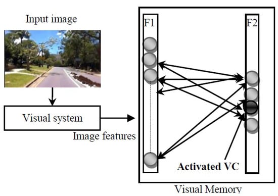Cognitive maps have been applied in scene recognition. For example, Rebai et al., presented an approach for indoor navigation that builds a visual memory that allows spatial recognition without storing visual information [94]. This approach builds the visual memory using Fuzzy ART, a model capable of rapid stable leaning of recognition categories in response to arbitrary sequences [95]. Authors propose this idea as a way of imitating the biological processes that encode spatial knowledge, mimicking how animals recognize previously visited places through cognitive maps. To achieve this, data association mechanisms are implemented to describe the robot environment that allows recognizing places already visited [96]. The system consists of constructing an incremental visual memory using Fuzzy ART and the visual features are used as input signals to create a visual cell representing the perceived scene (see Figure 6). In addition to this a bio-inspired process of Visual attention (VATT) is obtained, consisting of processing a certain part of the scene with more emphasis, while the rest is dismissed or suppressed.