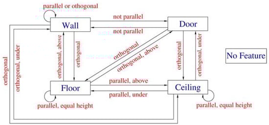 The differentiation of elements of the environment is called as semantic mapping by many authors, also in outdoor navigation works. Li et al., they differentiate in the image that perceived from the environment what is road, sidewalk, wall, terrain, vegetation, traffic sign, pole and car [100]. Returning to indoor navigation, in the case of work that has already been mentioned [83], the authors focused on differentiating the following elements from the environment: wall, door, floor and ceiling. Rules were created using Prolog to implement the restrictions of the characteristics that differentiate the classes, being these purely visual. In Figure 8 the network of restrictions that defined these elements is shown, while Figure 9 shows the result of the object detection such as the fire extinguisher, a printer and an indoor tree in a flowerpot. The low-level mapping was a 3D SLAM.