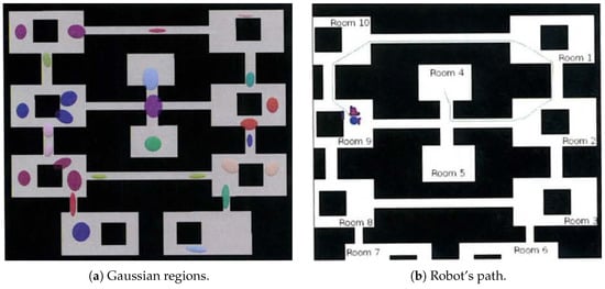 Rooms and dooways represented by Gaussian regions and the robot’s path to room 4 from room 9 [16].