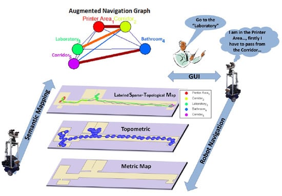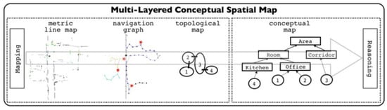 People identify the place where they are both spatially and conceptually. If a person moving through an indoor environment is asked about the trajectory of their displacement, they will not answer in terms of nodes or coordinates. Instead, people tend to provide concepts such as “I was in the living room and I went to the kitchen to drink a glass of water”. In this regard, there are efforts towards including semantic concepts of the environment in robot navigation. This can be achieved by implementing cognitive maps, an approach able to encode information about the relationships between concepts in the environment. Concepts are high-level (abstract) entities that group objects (e.g., chair, table, bed) and places (e.g., bedroom, office, kitchen), utilities (e.g., used for sitting) and the relationships between them. Objects and places detected in the environment are translated into physical entities. These entities can also be related to concepts, such as the utility of an entity. This kind of representation allows robots to build maps that can be understood by humans, thus reducing the gap between geometric interpretation and high-level concepts.
