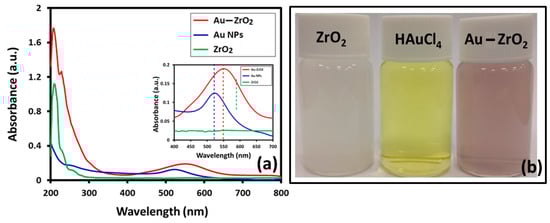 Initially, UV analysis confirmed the preparation of Au-ZrO2, as shown in Figure 1a. To compare the influence of Au in the absorption properties of Au-ZrO2 nanoparticles, we also measured the UV-Vis spectroscopy of pristine ZrO2 and Au nanoparticles respectively. Interestingly, it was observed that ZrO2 NPs also acted as a catalyst in the formation of Au NPs, since under similar conditions in the absence of ZrO2, Au precursor did not reduce to produce Au NPs. While, in the presence of ZrO2 nanoparticles, Au was deposited within 5 min, which was reflected by the color change of the solution (Figure 1b) and confirmed by UV-analysis. To compare the surface plasmon band, Au NPs are synthesized using the same concentration of Au precursor (HAuCl4) but using citric acid as a reducing agent. The UV spectrum of Au-ZrO2 exhibited a broad absorption peak centered at ~560 nm, which indicated the formation of smaller size Au NPs [24]. The citrate reduced Au nanoparticles showed surface plasmon band centered at ~523 nm. As expected, there was a redshift of about 27 nm in the plasmon bands of Au-ZrO2 nanoparticles as compared to pristine Au nanoparticles. The red-shift in the plasmon band can be attributed to the close contact of the Au and ZrO2 interface that results in the effective local dielectric function around the gold [10], which was found to be in line with the classical Mie theory [25]. Besides, the shift in surface plasmon band Au, the absorption band of ZrO2 also red-shifted from 280 nm to 320 nm. This could be due to surface defects created by the binding of Au NPs on the surface of the ZrO2 NPs [26].