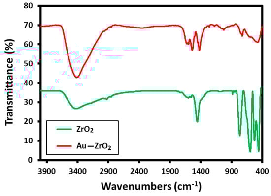 These results are consistent with the evidence obtained from FT-IR analysis. The FT-IR spectrum of Au-ZrO2 is almost similar to the IR spectrum of pristine ZrO2 NPs containing benzyl alcohol as stabilizing ligands. The IR spectrum of Au-ZrO2 contains various characteristic peaks of benzyl alcohol including the peaks between 3600 to 2900 cm−1 corresponding to hydroxyl groups, C-H stretching of the aromatic ring, and C−H stretching of CH2 (methylene) groups. The vibrations of phenyl rings appeared in the regions of 1900 to 1600 cm−1. Whereas, the characteristic peaks of O−H, and C−O stretching occurred in the range of 1420 to 1330 cm−1 and 1080–1022 cm−1 respectively. The existence of benzyl alcohol on ZrO2 can be confirmed by comparing the IR spectra of ZrO2 and Au-ZrO2 (cf. Figure 2) indicate the presence of benzyl alcohol attached ZrO2 and Au-ZrO2 NPs. However, the concentration of benzyl alcohol is much reduced in the case of Au-ZrO2 NPs.