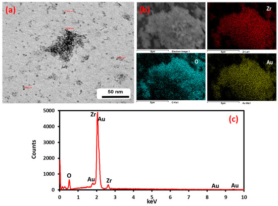 TEM, SEM, and EDX analysis of Au-ZrO2. (a) The dark contrast in the TEM image indicates the presence of gold nanoparticles (b) the color mapping of the sample under SEM analysis clearly indicates the presence of Zr and gold in the sample. (c) EDX also points towards the presence of Au and Zr in The Au-ZrO2 Sample.