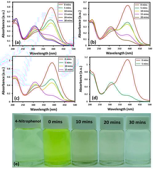The reaction can be easily tracked by the change in the characteristic absorption peak of 4-nitrophenol at ~400 nm. In the presence of NaBH4 and catalyst, the absorption band of 4-nitrophenol at ~400 nm, disappear and a new band emerges at a lower wavelength at ~300 nm, which indicates the successful transformation of 4-nitrophenol to 4-aminophenol [42]. Although, the transformation of nitro to amino phenol is thermodynamically favored in the presence of NaBH4, still, a catalyst is required to clear the kinetic barrier caused by the difference of potential between donor and acceptor [43]. The Au-ZrO2 nanocatalyst may facilitate the transfer of an electron from BH4− ions to the nitro group of 4-nitrophenol and reduce it to 4-aminophenol with improved reaction rate. Upon addition of Au-ZrO2, the intensity of the absorption band of 4-nitrophenol at ~400 nm gradually decreased with the emergence of a new band at ~300 nm indicating the formation of 4-aminophenol. The reaction was completed within a short period of time between 5 to 30 min depending upon the amount of catalyst used. With increasing the amount of Au-ZrO2 nanocatalyst from 0.25 mL to 1 mL the reaction time decreased from 30 min to 5 min, respectively, as shown in Figure 5. Notably, in the absence of catalyst, the peak at the 400 nm decreased slightly even after a long reaction time (several hours). This clearly depicts the inefficiency of NaBH4 towards the reduction of 4-nitrophenol and the importance of Au-ZrO2 during this process.