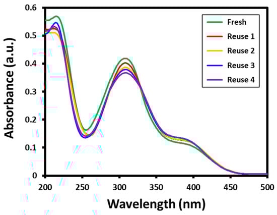 Furthermore, the stability of the Au-ZrO2 nanocatalyst was tested by repeated use of the same catalyst for the reduction of 4-nitrophenol several times. The reusability of the catalyst has significant importance from both academic and commercial aspects. In this case, to evaluate the reusability of Au-ZrO2, the reduction of 4-nitrophenol was performed five times using the same catalyst. After every reaction, the catalyst is isolated by centrifuge and reused for another reaction. All the reusability tests are carried out using 0.25 mL concentration of catalyst; however, the substrates and catalysts are taken in large amounts to recover a sufficient amount of catalyst required for further reactions. The results of the recycling of Au-ZrO2 are shown in Figure 6. The results revealed that the catalytic activity of Au-ZrO2 was only slightly affected even after five cycles. During the reusability tests, the conversion of 4-nitrophenol was slightly decreased in each reaction which could be due to the weight loss of catalyst while recovery (during filtration). For instance, during the first reaction using fresh catalyst, 4-nitrophenol was completely converted to 4-aminophenol in 30 min, however in subsequent reactions conversion was slightly reduced after every reaction during the same reaction time, as reflected by the decrease in the intensity of the absorption peak of 4-aminophenol at ~300 nm (cf. Figure 6).