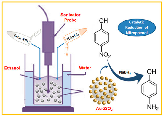 Recently, sonochemical methods are considered as effective techniques for the preparation of different types of nanomaterials [21]. The dissociation of water molecules under ultrasonic conditions produces respective H and OH radicals from water vapors, that act as active species, which facilitates the oxidation and/or reduction of precursors [22]. Herein, we successfully prepared the Au-ZrO2 nanocatalyst under ultrasonic irradiation using ZrO2 support (cf. Scheme 1). The ZrO2 nanoparticles were prepared to employ a solvothermal approach [23]. The reaction was performed under facile conditions at room temperature within a very short time period (i.e., 5 min). The preparation of Au-ZrO2 was confirmed by various characterization techniques. The as-prepared Au-ZrO2 sample was tested as a reduction catalyst for the conversion of 4-nitrophenol to 4-aminophenol under stirring at room temperature, and the progress of catalytic conversion was monitored using UV-Vis analysis.