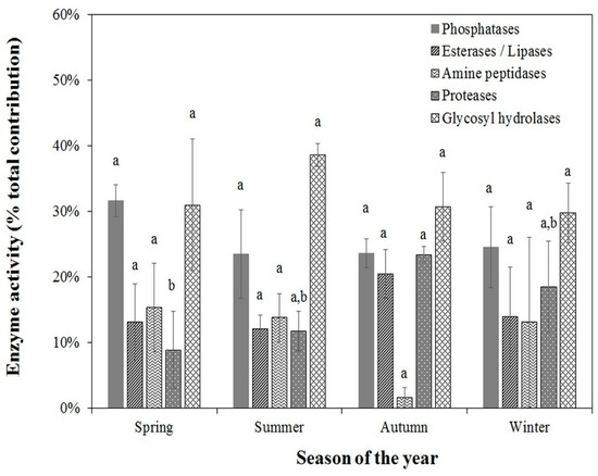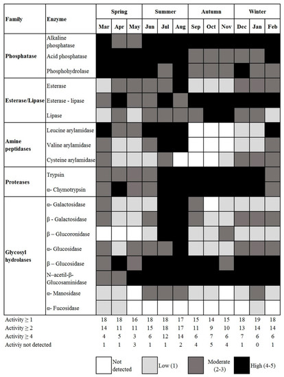 - Patel, D.; Gismondi, R.; Alsaffar, A.; Tiquia-Arashiro, S.M. Applicability of API ZYM to capture seasonal and spatial variabilities in lake and river sediments. Environ. Technol. 2019, 40, 3227–3239. [Google Scholar] [CrossRef] [PubMed]