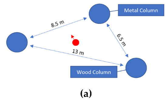 The first two tests consist of the free exploration of an unknown scenario (Figure 6a,b) within a time limit. The blindfolded subjects were told to move freely, make their own judgements about the audio spatial cues, and afterwards draw a sketch of how they perceived the scene. The sketch must be a bird’s eye view of the scene and must be drawn within a square representing the football field (scale reference).