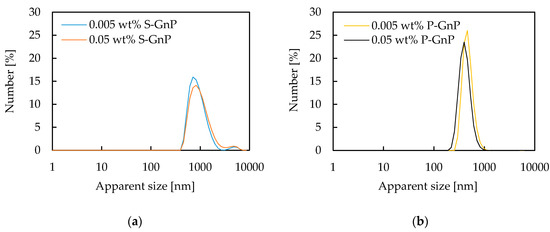 Size distribution by number for the S-GnP (a) and P-GnP (b) dispersions in water.