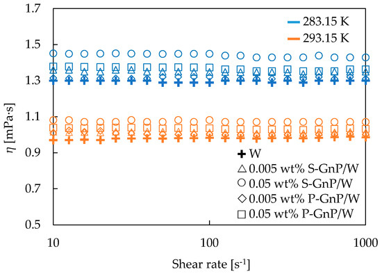 Flow curves for the different loaded S-GnP and P-GnP nanofluids in the 10 to 1000 s−1 shear rate range at 283.15 K (blue) and 293.15 K (orange).