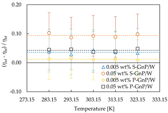 Increases with the rising nanoadditive concentration are observed for both nanofluid sets. Viscosity is usually defined as the internal friction of fluids caused by the molecular cohesion that provokes resistance to flow [56]. The dispersion of nanoadditives in a fluid leads to a higher level of friction, which implies a greater resistance to flow and consequently higher viscosities. These slight increases for the analysed concentrations show maximum values of 10% and 4.9% for S-GnP and P-GnP dispersions, respectively. Note that the reported increases for S-GnP are twice as high as those for P-GnP. Figure 3 shows the dynamic viscosity increases in relation to the base fluid for the different-loaded nanofluids. These increases appear almost temperature-independent in the whole analysed temperature range, as we also previously pointed out for other samples [43].