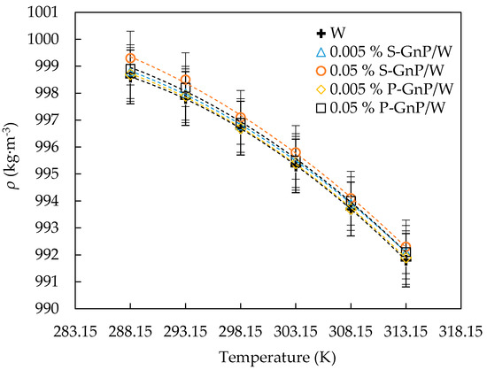 Figure 4 shows the temperature dependence of density for all the samples, compared with that measured in the case of pure water. The experimental density values for the base fluid at temperatures from 283.15 to 323.15 K agree well with literature, maintaining deviations below 0.08% [51]. On the other hand, from Figure 3 we obtain that, for all samples, the density decreases with the increasing temperature of 0.7% within the analysed temperature range. As regards the density behaviour with increasing nanoadditive concentration, the variations between the different-loaded samples lie within the experimental uncertainty in all cases. Nevertheless, it can be pointed out that all nanofluids showed slight systematic higher values than the base fluid that reach a 0.07% increase for the 0.05 wt% S-GnP nanofluid. Furthermore, the small increases are always higher for S-GnP than for P-GnP for the same concentration.