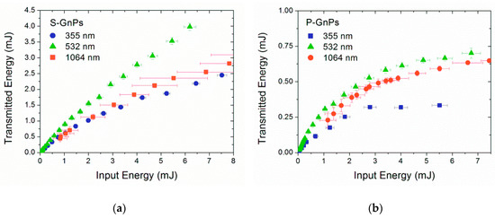 Figure 5 reports the results concerning the non-linear behavior of the two different kinds of nanofluids, for three considered wavelengths. The P-GnP samples often result in a considerably lower non-linear transmittance if compared with the corresponding S-GnP nanofluids, according to the comparison between linear extinction coefficients. The more pronounced non-linearity is always at 355 nm and the less pronounced is at 532 nm, with the 1064 nm showing an intermediate behavior. Interestingly, the relative wavelengths trend does not reflect the relative values of linear extinction coefficient, deserving further investigations. At higher input energies (not shown in Figure 5) the 1064 nm curves change the concavity, resulting in a non-monotonic behavior. This effect could be explained by a damage occurring in the nanostructures, as already hypothesized in other studies for different carbon derivatives [60].