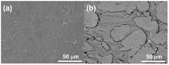 Figure 1. Microstructure of 13CrMoNbV steel (SEM) (a) as-cast and (b) after the annealing at 1250 °C for 5 min.