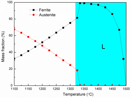 Thermodynamic analysis of the phase composition was carried out to obtain the appropriate temperature range for hot deformation. As shown in Figure 2, the mass fraction of ferrite in 13CrMoNbV steel increased with the rise in temperature by reducing the austenite phase. The equilibrium temperature of the liquid phase appearing is 1317 °C. After the disappearance of the austenite phase, the ferrite mass fraction decreases until the liquidus temperature of 1497 °C. In accordance with the calculations, the temperature of 1275 °C was chosen as a maximum deformation temperature.