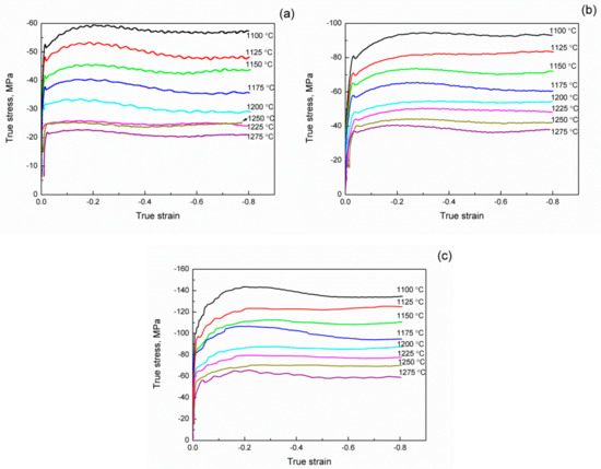 Figure 3. True stress curves at temperatures in the range of 1100 to 1275 °C and strain rates of (a) 0.1 s−1, (b) 1 s−1 and (c) 10 s−1.