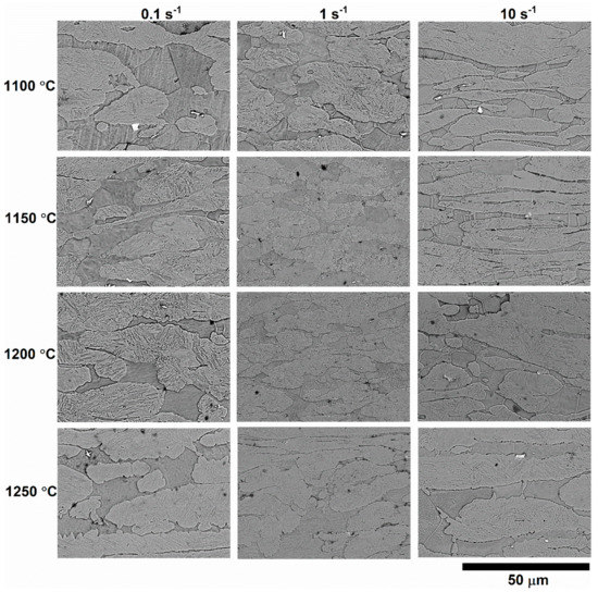 The microstructure of 13CrMoNbV steel after hot compression at temperatures of 1100, 1150, 1200, and 1250 °C with strain rates of 0.1, 1, and 10 s−1 is shown in Figure 4. As one can see, the deformation at the strain rate of 10 s−1 stretches the equiaxed ferrite grains into fibers. The fibers are divided into separate grains/subgrains, the sizes of which are increased with increases in the deformation temperature. Deformation at a lower strain rate leads to the formation of the equiaxed ferrite and martensite (former austenite) grains/subgrains, the sizes of which are slightly influenced by the deformation temperature.
