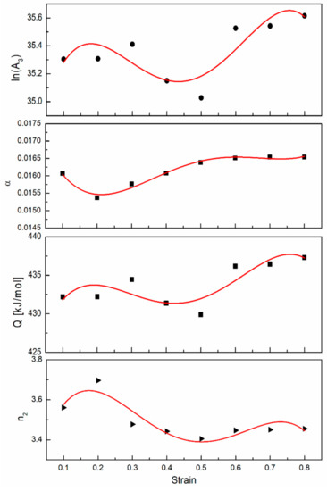The values of A1, A2, A3, n1, n2, β, α, and Q constants at different strain values were calculated using the multiple linear regression of Equations (2)–(4) in linearized form. As one can see in Figure 5, the values of A3, n2, α, and Q3 constants are significantly dependent on true strain due to changes in the microstructure during deformation. To include the strain ( ε ) influence too, the constitutive Equation (3) was modified by using fourth-degree polynomial dependence of the material constants [28,29]: