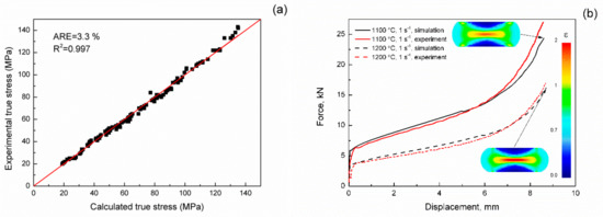 As one can see in Figure 6a, the average difference between calculated and experimental flow stress values is 3.3%. In addition, the accuracy of the constitutive model was checked by the modeling of the samples’ compression at a strain rate of 1 s−1 using the FEM method. The comparison between measured and simulated force vs. displacement dependences for 1100 and 1200 °C temperatures (Figure 6b) shows the satisfactory predictability of the model.