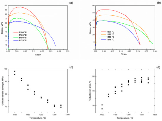 Figure 7. Hot tension curves (a,b), ultimate tensile strength (c) and reduction of area (d) of 13CrMoNbV steel at temperatures in the range of 1100–1275 °C.