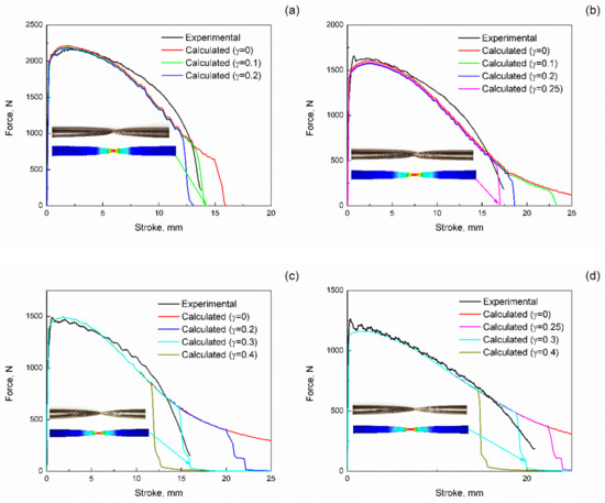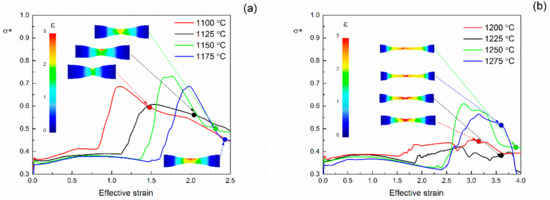 The tensile tests with zero fracture criteria value were calculated using the finite element approach for the determination of the dependence of stress triaxiality on equivalent strain (Figure 9). The integration of obtained dependences using Equation (11) with different values of the γ coefficient give the critical values of the fracture criteria K * . To determine the correct values of the γ coefficient, it is necessary to compare the experimental force vs. displacement curves calculated using the FE approach curves obtained at different γ and K * . The comparison of the predicted and experimental curves is shown in Figure 10. As can be seen, the optimum value of the γ coefficient is changed from 0.1 at the temperature of 1100 °C to 0.3 at temperatures of 1200 and 1250 °C. The increase in the γ coefficient with the increase in temperature shows that recovery of the accumulated strain at a high temperature significantly prolongs deformation before fracture, even during extremely localized deformation. Optimized values of the fracture model coefficients γ and K * are depicted in Table 3. The critical value of the ductile fracture criteria K * is increased with temperature increase from 1.58 at 1100 °C to 2.20 at 1250 °C, which correlates with the tensile samples’ reduction of area until fracture.