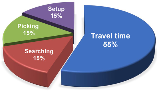 In manual picking, four activities represent the total time [2]: setup, searching, picking and travel times. The travel and picking times are the time needed to go to and between the picking aisles; the latter comprises the greatest part of the expense of retrieved shown in Figure 1, which is itself the most expensive part of warehouse operating expenses; thus, it is the main option to improve the performance of this process [6]. It also represents the only variable part, while the rest of the components (searching, setup and picking) can be considered constants [3]. As reported by [27] the travel time is determined by the total length of the tour realized for the picker.