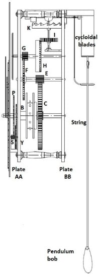 The gear train is configured on three axes interconnected by wheel-pinion assemblies that are responsible for managing the clock hands. The mechanism of the transformation of the circular movement into an oscillatory movement is composed of a crown wheel, K, that rotates around the vertical axle and transforms its rotation into oscillation of the rod, S, thanks to a horizontal axle with vanes, LM, held by the so-called ‘Gnomons’ (parts where the axles are housed). Finally, the elements associated with the pendulum are the pendulum itself, its support, and the cycloidal blades that limit its movement on either side, transmitted thanks to the rod, S.
