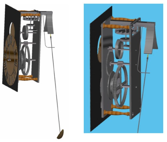 The 3D model of the isochronous pendulum clock has been obtained with exactly the same proportions as those described in the work Horologium Oscilatorium, thanks to the sizing criteria adopted. However, the only information available regarding the operation of the pendulum clock appears as a brief description of the parts that compose it, the number of teeth of each wheel, the speed at which each axle should move, and the dimensions that the pendulum should have to mark the seconds. There is no information regarding the shape or dimensions of each piece, and hence the design proposed in this research has been created with only the graphic information available in Figure 1. Specifically, given the absence of detailed information regarding the dimensions of the elements, it has been assumed that the gear train as a whole measured vertically one third or, at most, half the length of the pendulum, which has enabled the primitive diameter of the largest wheel (crown wheel), C, of the gear train to be estimated as being 240 mm. From this dimension, it has been possible to define the dimensions of the rest of the wheels and the positioning of the axles, since the dimensioning of a pendulum clock is totally parametric, and depends solely on the length of the pendulum, which univocally implies a relationship of gears.