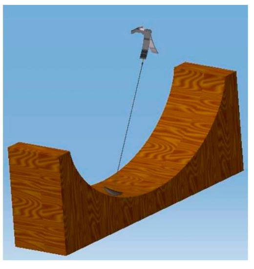 In the screenshots of the animation of Figure 16, the good approximation of this model can be appreciated: The chain (simulated string) is curved before reaching the cycloidal blade, and, exactly at the moment of arrival, its form is adopted. Although the chain does not move exactly like a string, the pendulum shaft carries the necessary movement to regulate the march of the clock. The reason why a greater number of links was not been chosen, which in principle would appear to guarantee a greater reliability of the model, lies in dimensional and geometric causes. From the dimensional point of view, the pendulum section that was represented (which was small in size), could not be easily represented with more than seven links, while from the geometric point of view, seven links sufficiently rectified the cycloid, a curve to which the pendulum had to adapt geometrically. Thus, seven links provides a working scenario of relative comfort and, as seen in the videos and animations obtained, the pendulum describes the cycloid very closely.