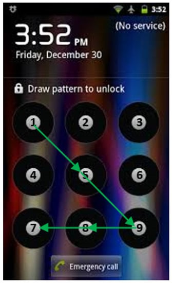 Although pattern unlock is a convenient scheme for protecting the user’s device, it is also susceptible to a number of attacks, including guessing attacks [], shoulder surfing attacks [], smudge attacks [], and side-channel attacks [,]. It was shown in [] that smudge attacks were able to break the pattern up to 68% of the time. The success rate of guessing attacks can be greatly improved from 13.33% to 74.17% when assisted by smudge attacks []. The study of [] showed that patterns are more memorable and easier to be spied on through shoulder surfing attacks compared with PINs. Ye et al. [] developed a computer vision algorithm that can track the user’s finger movement to infer the pattern drawn on the screen. Their approach can break over 95% of the patterns in five attempts before the device is automatically locked by the Android system. Thus, there is a great need to enhance the security of pattern unlock to defend the attacks.