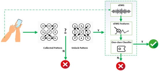 Pattern unlock is a popular screen unlock mechanism, but has relatively weak security compared with other mechanisms, such as the PIN and password. It is susceptible to various attacks, including guessing attacks, over-the-shoulder attacks, smudge attacks, and side channel attacks. In this paper, we proposed a new two-factor authentication scheme that utilizes sEMG-based biometrics to enhance the security of pattern unlock. The proposed scheme uses time domain features extracted from recorded sEMG signals and one-class classifiers to determine the authenticity of the user. To test the effectiveness of the proposed scheme, 10 subjects were recruited for the study. The results show that the proposed scheme achieves good authentication performance in terms of  score and HTER. In addition to mobile devices, the proposed scheme has the potential to be applied for the vehicle access control system of electrical vehicles (EVs) which is projected to be a 22.6 billion market by 2027 []. There are several limitations of the current research. First, the sEMG acquisition system used in the experiment was for the purpose of proof-of-concept, which is not intended for real-world applications. Wearable wireless sEMG acquisition devices, such as the MyoWare Muscle Sensor [] or Myo Armband [] with better usability should be considered in those scenarios. The second limitation is the relatively small number of subjects recruited for the experiment. We plan to perform larger-scale testing of the proposed scheme in the future. Finally, the experiment conducted in the paper only considered the scenario of using both hands to unlock the device. In future studies, we will also consider the scenario of using only one hand to unlock the device.