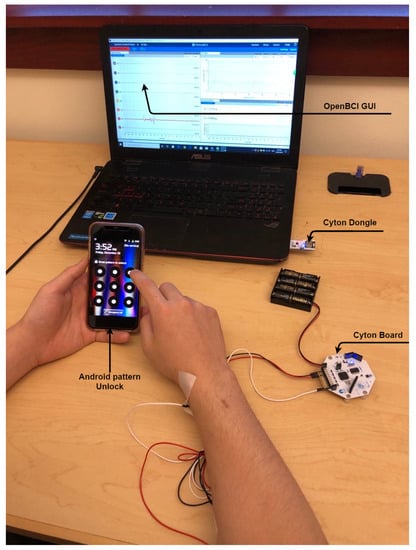 Recently, the use of physiological biometrics for mobile user authentication has increased significantly. Huang et al. [] proposed a privacy-preserving ECG-based authentication scheme that utilizes the ECG signal acquired by a medical IoT for ECG monitoring to authenticate the patient. A mobile EEG-based biometric authentication system was developed in [] that combines EEG recordings with other techniques, such as nearfield communication (NFC) and face recognition. Kumar et al. [] proposed a framework to enhance the pattern-based authentication with EEG signals. The Hidden Markov Model (HMM) was applied to model the EEG signals recorded during pattern drawing. The Support Vector Machine (SVM) classifier was then used to verify the authenticity of the drawn pattern. In the studies of [,], sEMG signals generated from a list of gestures were used for mobile user authentication. A list of gestures is used as the password, which is combined with the features extracted from the sEMG signals to defend against shoulder-surfing attacks.