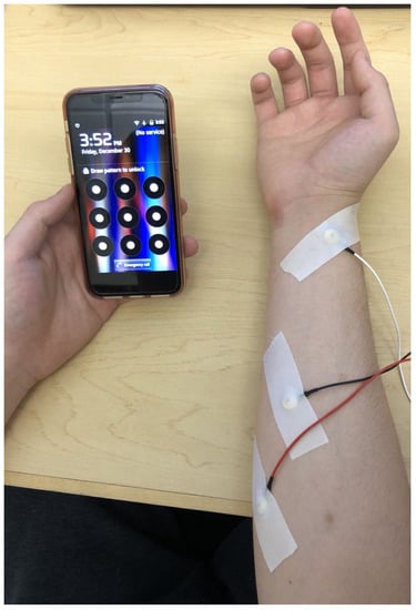 During the experiment, each subject was comfortably seated on a chair before a table. The electrodes were placed on the subject’s forearm, as shown in Figure 4. Before electrodes were placed, an alcohol pad was used to clean the skin of the electrode sites. The electrode cap gel was applied to the cleaned skin’s surface to reduce electrode–skin impedance for better recording.