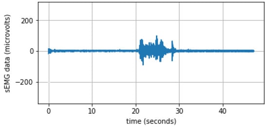 The quality of the recorded raw sEMG signals was affected by noises, such as direct current offset, environment noises, and artifact noises. We applied a 5Hz high-pass filter to eliminate the direct current offset, baseline drift due to the movement in recording, and perspiration. A 60Hz notch filter was then applied to filter out the power-line noise. Figure 5 shows an example of recorded sEMG signal after pre-processing.